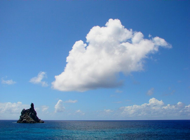 The tiny, but impressive island Ilha do Frade ("Friars Island"), off the south coast of Fernando de Noronha. And the Atlantic Ocean and a passing cloud mimicking the island. |