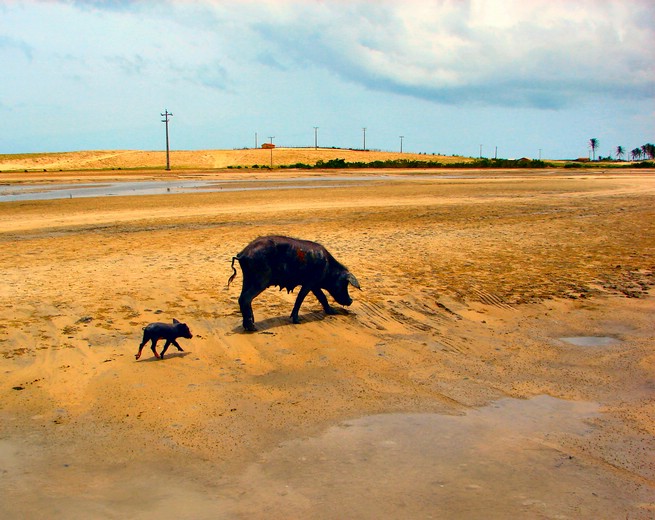 Pigs thrive in the sandland by the coast. After heavy rains they can merrily roll in the mud, and when they're hungry they use their snouts to dig for lovely crabs and seashells, the same way their European collegues hunt for truffles in the woods. |