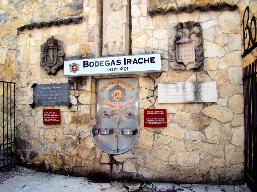 Mange steder langs stien finner du kraner hvor du kan fylle på med drikkevann. Like etter at du vandrer ut av Estella finner du noe litt annet. Vingården Bodegas Irache tilbyr pilgrimene å fylle flaskene sine med vin fra en eller annen gigant-tank som må stå på den andre siden av denne veggen.