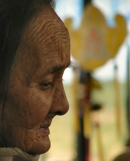 Gammel kone på bussen til Nha Trang. Hun er nok ikke så trist som hun ser ut, for hun fikk sitte fremst i bussen og hoiet og skrek frydefullt hver gang vi akkurat såvidt klarte å ikke kjøre på noen. |
