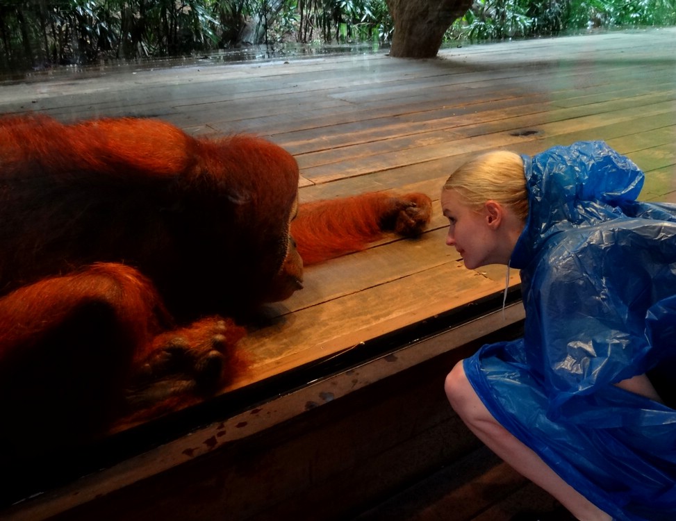 This is what happens when a red creature of the forest meets a blue being from the city. The fascination is equally large in both cages. |