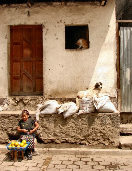 Village life in Santiago by Lake Atitlan. The daughter in the house tries to squeeze some money out of lemons from the family's garden, the dog guards the corn meal and the cat in the window does what cats do. |