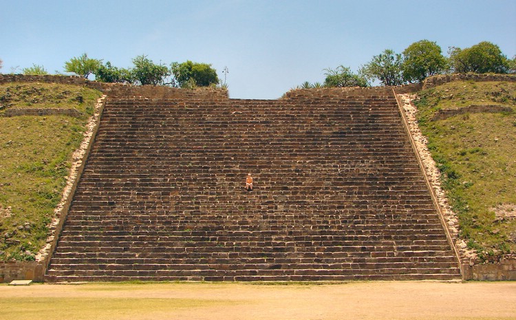 From the Monte Alban ancient Maya site near Oaxaca. My friend Maria demonstrates that the old Mayans must really have liked to just sit around in the stairs, chatting away about the latest beheadings or other human sacrifices, or something. There's room for a lot of them! |