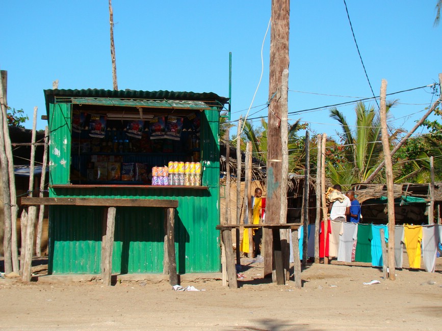 A typical tiny shop in rural Mozambique. They have everything! To be more exact, they have beer, soft drinks, potato chips, cigarettes, biscuits, cereals and soap. If you need something else, you'll have to be lucky to find it. |