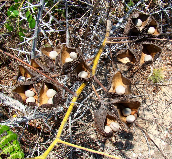 | Jeg er ikke sikker på hva dette er. Enten er det en plante som har lært seg å bygge reir til frøene sine, eller så er det en plante som har utviklet pung og testikler med torner på. Uansett er det litt av en sensasjon, spør du meg. |