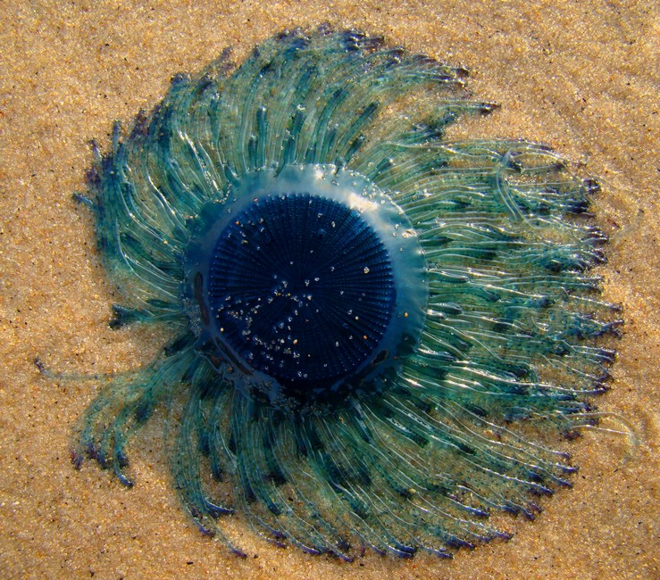 | En porpita! Eller en blåknapp, om du vil. Det er enda en kolonimanet. I enden av trådene der er det giftige brennceller, men de brenner ikke menneskehud så veldig, så denne kan du leke litt med hvis du kommer over den i havet. |