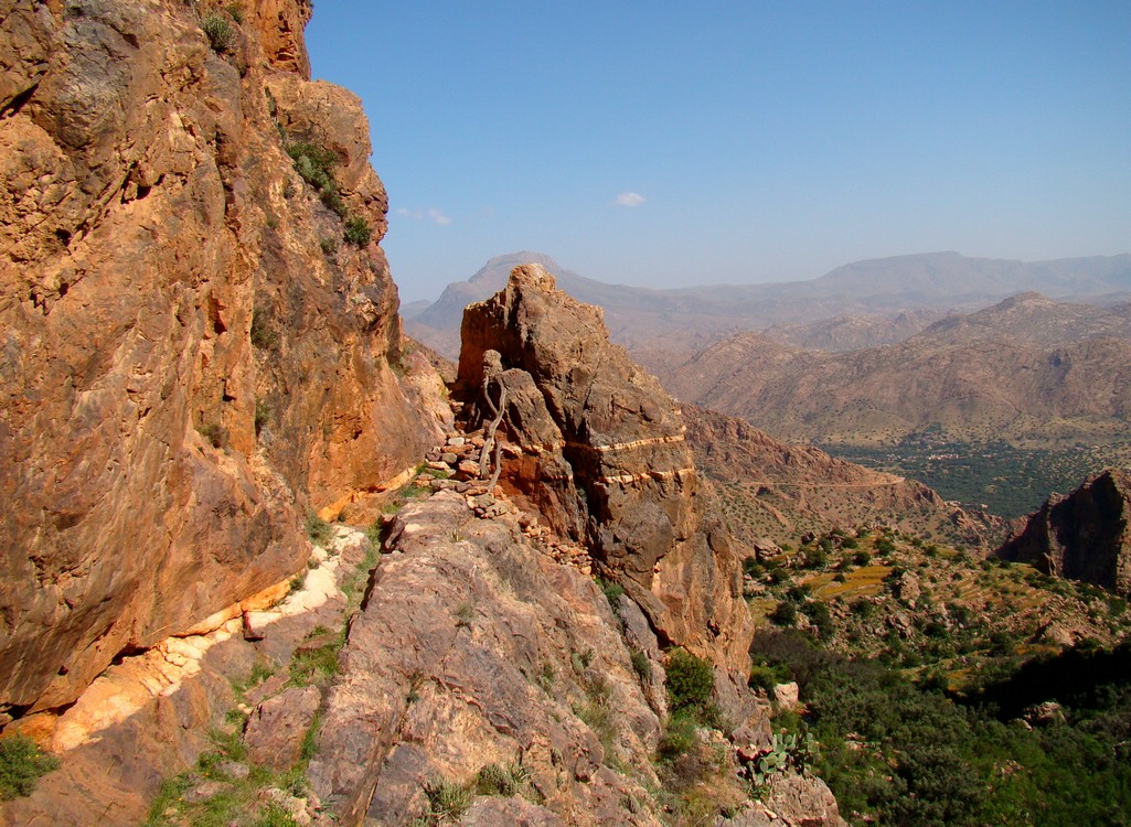 The road ends in the village, so we continue on an ancient mountain trail. The peak we're heading for is said to have been a sacred site for ancient religions. Next to the trail there is, well, mostly air, so fortunately the view isn't too distracting. Uhm, well, keep your eyes on the trail anyway. |