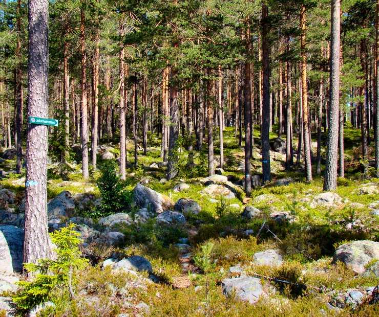 Sånn ser det ut ganske mange steder, men her ved Avalsjøen er merkingen av stien spesielt god. Klart og tydelig Jotunheimstien-skilt, og så opptil flere blåmerkede trær innover i skogen. |