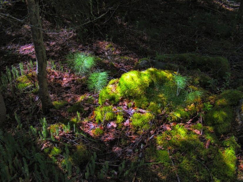 Det var ikke helt sant, det jeg sa om at det ikke er stort av farger å se i granskogens dype bunn. Vanligvis er det ganske mørkt og dystert der, men noen ganger slipper en og annen solstråle igjennom, og da kan man få se noe fint, mykt og koselig på skogbunnen. |