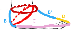 Finn lengden (B’) fra vrista mot tærne som tilsvarer lengden fra vrista til under hælen (B). Restavstanden videre frem til tåspissen tilsvarer hvor langt du kan nålebinde på tåstykket (D) før du begynner på kimen til sålen (C). Kimen blir da C-D lang.