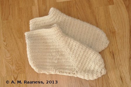 Som beskrevet hos Shelaglewins må man felle av i “hjørnene” mellom sålekimen og runden som går rundt selve foten. Akkurat i hjørnet binder jeg sammen 2 og 2 masker (jeg binder sammen 3 eller 4 par). Dette mønsteret gjentas hele veien inntil rundt inntil stykket som går på oversiden av foten og bak hælen har omtrent lik høyde. De 2-3 første rundene under hælen legger jeg ut tilsvarende i ytterkant, men de neste rundene legges det ikke mer ut rundt hælen.