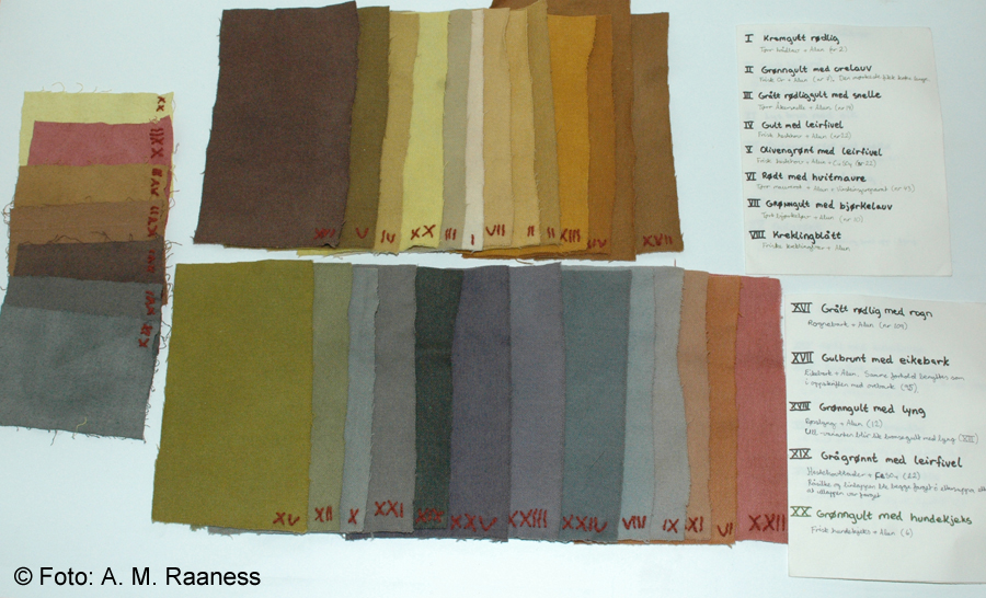 Hilde Thunem er en av de grundigere og mest systematiske personene jeg kjenner. Hun har blant annet laget en rekke plantefargede stoffprøver som jeg har fått lov til å låne og legge ut bilde av her.