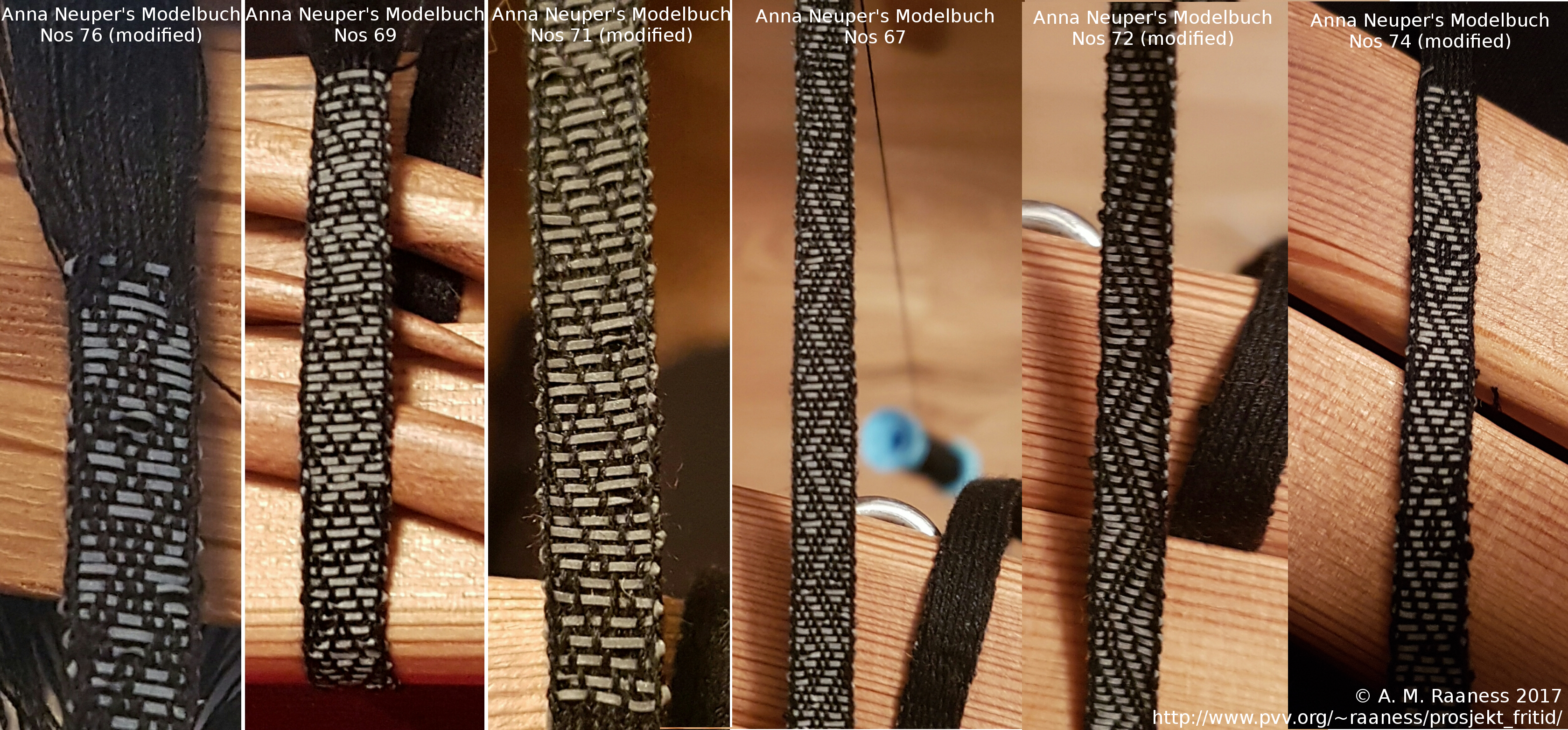Brocading and tablet weaving my way through some of the patterns in Anna Neuper’s Modelbuch. At first working with sewing silk and modern reflective thread (for a modern end use) and Mölnlycke metallic thread. The last picture show my testing of single/double pattern weft (#74, double #74 & #65), single/double tie-down (#68 & 75), two-color and various places and methods of turning the brocading weft (#68/73).