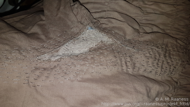 Testet ut shashiko/doro-inspirert lappeteknikk, dog med lappen på innsida og garn/tråd som matchet fargen på stoffet.