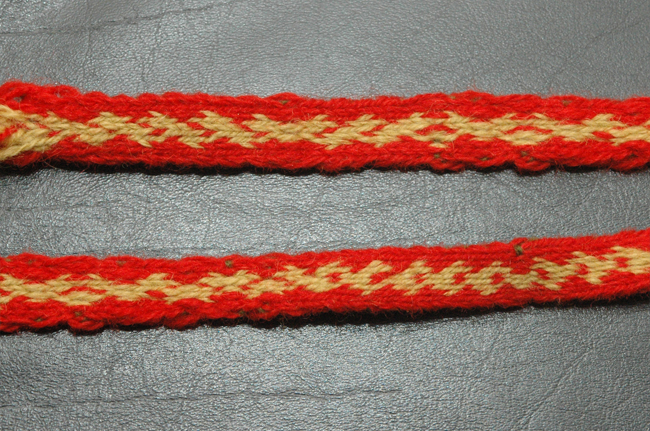 Her er et bånd jeg har laget med tanke på Mona, som trengte noe å pynte et vikingskaut med. Det matcher tilfeldigvis fargene i kostymet hun bruker i koret i Korsvikaspillet…. Hm… Snodig.. 😉